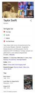 Wenn der Nutzer eine Suchanfrage über eine Person oder einen Ort (real oder fiktiv) aufgibt, wird häufig in der rechten oberen Ecke der Wissensbereich angezeigt. Hier werden Informationen zu der Suchanfrage aufbereitet und anschaulich präsentiert.