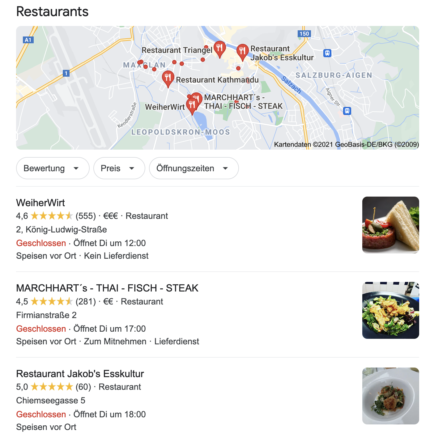 Jenes Feature beinhaltet Ergebnisse, welche sich nach der lokalen Suche richten. Es umfasst eine kleine Google Maps Karte, in dieser zum Beispiel Restaurants oder Geschäfte markiert sind. Anschließend werden drei Google My-Business-Profile vorgeschlagen, welche mit der Suchanfrage übereinstimmen.