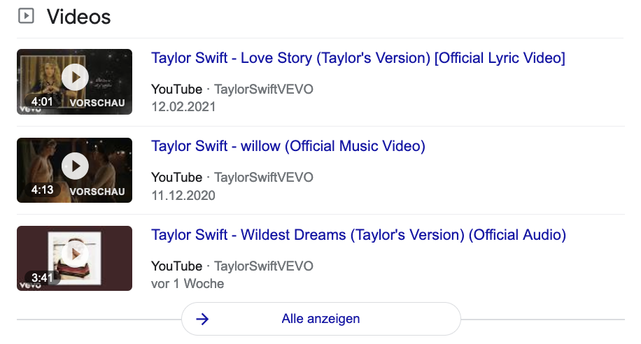 Das letzte Feature ist das Video-Feature. Hierbei werden hauptsächlich YouTube-Videos angezeigt und dem Nutzer passend zum Suchbegriff vorgeschlagen. Sollte Ihr Unternehmen einen YouTube-Kanal besitzen, ist dies ein guter Weg, um Ihre Videos in den Suchergebnissen zu platzieren. Damit Ihr Video angezeigt wird, ist es empfehlenswert, wichtige Keywords in den Titel und die Beschreibung ihrer Videos zu schreiben.